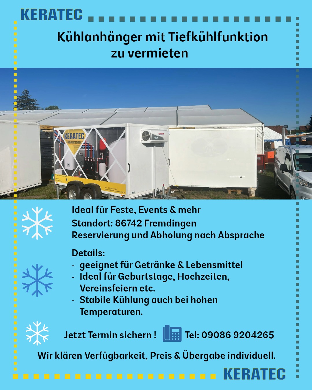 Ob für eine notfallmäßige Überbrückung oder für Festivitäten etc steht Ihnen unser Kühlanhänger (Kühl- & Tiefkühlfunktion) zur Verfügung.